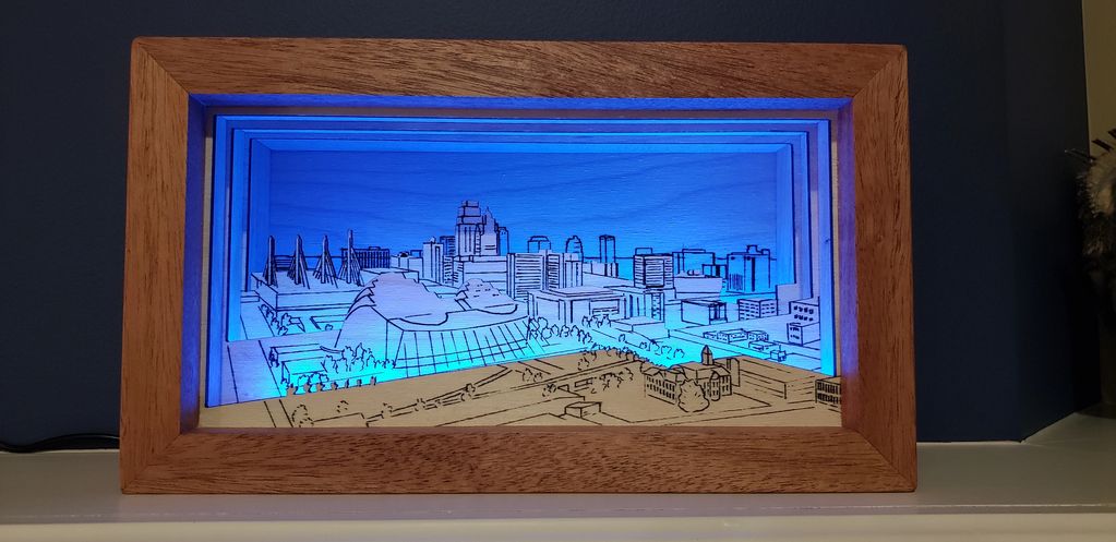 This 3D light box changes colors from blue, green, yellow and red. Or it can be set to just one color. It depicts a hand drawn Kansas City skyline. The box is made from African Mahogany, and the image levels were laser engraved and cut.